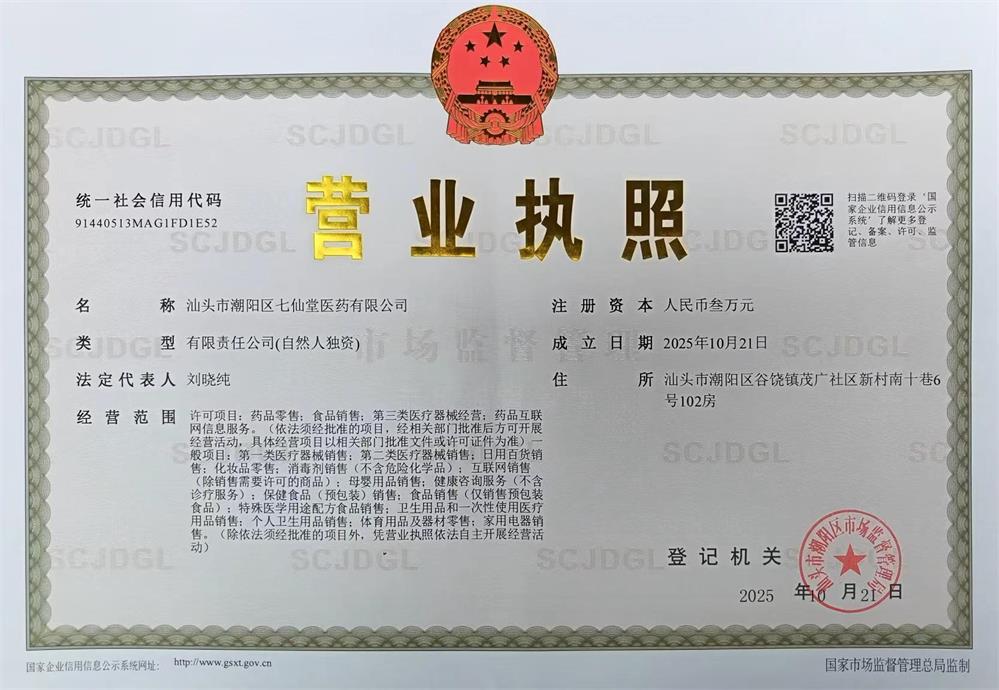 汕头市潮阳区七仙堂医药有限公司,企业注册地址位于汕头市潮阳区谷饶镇茂广社区新村南十巷6号102房。汕头市潮阳区七仙堂医药有限公司成立于2018-12-21,法定代表人为吴泽扬,注册资本为10万元,统一社会信用代码为91440511MA52NMY69C,企业注册地址位于汕头市金平区金禧花园金杨4.5幢119号房、120号房之二,所属行业为科技推广和应用服务业,经营范围包含:生物技术的研发、推广;药品经营;食品销售;保健食品销售;餐饮服务;医疗器械经营;商务信息咨询;保健信息咨询;文化传播活动策划;销售及网上销售:农副产品,海产品,化妆品,洗涤用品,消毒用品,计生用品等。公司秉承“大众健康,我们的心愿”的经营理念,严把质量关,竭诚为广大客户提供优质的产品和服务。我们本着“开拓进取,互惠共赢,优质的服务”的企业精神,以规范、专业、创新、共赢的经营理念,在稳步发展的同时切实履行各种社会责任,树立可持续发展的奋斗目标。面向全国,服务社会,以人民利益为先,希望为人类健康事业做出更大的贡献。。